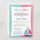 Gênero Revel Convite de festas com tema náutico e combinação cor rosa e azul brilhante.