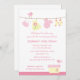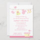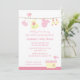 Este convite para o chá de fraldas 5x7 tem uma linha de roupas no topo com algumas roupas de bebê penduradas nele e um pássaro rosa na fila. No fundo, há uma borda rosa quente com uma cesta de roupa suja com uma flor nela, e um pássaro sentado nela. Suas informações de terceiros facilmente personalizáveis estão localizadas no centro. Estúdio de Cacau