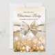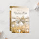 Design de fundo de marfim elegante com profusão de estrelas douradas e efeito de brilho em tons de ouro e marfim na área inferior da placa. O bonito arco de marfim e ouro acrescenta um toque final neste adorável modelo de convite de festas de Natal. Design da placa correspondente. Todo o texto em frente e verso está pronto para você personalizar com suas informações de convite de festas.