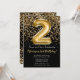 Convite de festas preto e segundo aniversário ouro elegante para uma menina de 2 anos com script elegante escrevendo design de fonte dourada e balões de folha divertida.