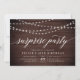 Nossos convites de festas de surpresa festivos apresentam um fundo rústico em placas de madeira com cordas de luzes brancas brilhantes no topo, e "festa surpresa" na tipografia de gráficos de caligrafia. Personalize com seus detalhes surpreendentes de comemoração em branco; pode ser usado para qualquer ocasião, como festas de aniversário ou festas de aniversário.