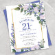 Honre uma mulher especial com este elegante e feminino aniversário de 21 anos de Orçamento Convite de festas Surpresa. Surpresa e 21 ruas estão escritas em grande texto azul. A Celebração de Aniversário segue. O nome do convidado também está em letras azuis. Os detalhes da comemoração de aniversário estão rodeados por um quadro de ouro chico. As flores azuis e as rosas brancas estão aninhadas em folhas verdes profundas.