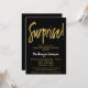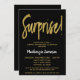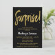 Um elegante, moderno convite de aniversário de surpresa preto e ouro. Texto do script de visão na parte superior e texto dourado abaixo com o nome em branco sobressalente