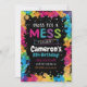 Vestir-se por uma bagunça e desfrutar deste convite de aniversário de tinta imprimível! É a maneira perfeita de convidar convidados para a festa de aniversário temática de arte do seu filho. Este convite de arte foi desenhado com uma borda colorida de tinta com respingos, fundo preto e texto artístico.
