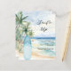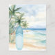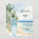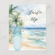 Um convite para uma festa de praia de verão. Uma praia arenosa de cor aquática, ondas oceânicas e palmeiras como fundo, e uma prancha azul na praia. 1 folha = 1 convite impresso de borda a borda.
