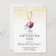 Um convite de festas de Ano Novo com um copo de champanhe com floral e um confete de ouro.