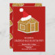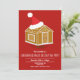 Uma casa de gingerbread decorando convite de festas com um desenho animado sorridente de uma casa de gingerbread que está vestindo um chapéu de Papai Noel.