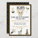 Você está dando uma festa de Véspera de ano novo? Convide seus hóspedes em estilo com essas bobinas de ouro divertidas e convites pretos. Há um chapéu de festa, balde de champanhe, panelas de confete, varas de ouro e preto e um cupcake brilhante com estrelas nele, assim como um despertador com muitas estrelas, confete e fitas brotando dele. O convite é cortado em ouro e preto. Personalize-o usando o modelo fornecido para criar um convite que é exclusivo seu! O verso da carta é preto com estrelas douradas por toda parte.