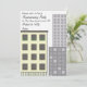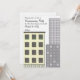 Um convite de festas do housewarming comemorar um apartamento novo. A parte dianteira caracteriza um prédio de apartamentos com prédios de escritórios altos no fundo. Personalize o texto na parte dianteira e na parte traseira.