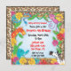 Os animais brilhantes e coloridos da selva dão-lhe boas-vindas a um partido com girafa, o elefante, a zebra, o macaco e o cobra amigáveis contra um fundo do impressão do leopardo com flores bonito. Excelente para o chá de fraldas ou a festa de aniversário! Ilustração tirada mão por McBooboo.