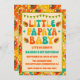 O primeiro convite de aniversário divertido apresenta ilustrações de fruta de papaya com aquarela, texto retrô fofo e cores brilhantes. A parte de trás tem um padrão amarelo de mamão laranja.