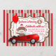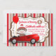 Convites de festas de aniversários de macaco-meia com um macaco-meia adorável num carro vermelho giro num fundo vermelho e castanho. Este primeiro convite de aniversário do macaco-meia é facilmente personalizado para o seu evento simplesmente adicionando os detalhes do seu ano e evento.
