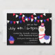Lama bonita num pom vermelho e um cobertor de estrelas azul e branca em um chapéu de topo para uma celebração de 4 de julho.