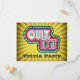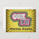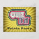 Um convite de festas de perguntas à noite. Com tipografia grande e ousada cercada por luzes de camarim. O fundo é um padrão amarelo de explosão solar.