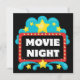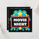 Este convite de festas temático da noite de cinema caracteriza um vermelho e o chapéu preto do famoso diz que a "noite de cinema" com as estrelas amarelas das nuvens do azul que cercam o famoso assina sobre um fundo preto na parte dianteira. A parte traseira do convite tem as áreas do modelo para você adicionar seus detalhes do partido. Clipart na parte de trás do convite inclui um vermelho e o branco "admite um bilhete" e um grande balde da pipoca.