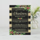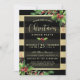Envie convites de festas de Natal elegantes e glamourosos para a sua festa de janto este ano com estes convites fáceis de personalizar/personalizar. A camada preta semitransparente tem uma borda ouro sobre um fundo de listras pretas e douradas horizontais. Os cantos são aparados com pererecas festivas de sangue e de abetos. O Zazzle tem várias fontes e cores de fonte diferentes para escolher. Note que todos os produtos Zazzle são impressos digitalmente em formato simples.