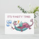 Um Convite de festas, com um dragão branco roxo e verde com balões, de uma pintura aquosa de Judy Adamson. Os cartões de aniversário e presentes também estão disponíveis.