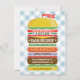 O convite muito bonito do CHURRASCO com um Hamburger empilhado, as cebolas, a salmoura, a alface, o cachorro quente, o queijo, a mostarda, a ketchup, o fundo do teste padrão do piquenique do guingão e a bandeira que lê "juntam-se nos!" Seu convidado amará este convite original do assado. Personalize com seu próprio texto. Verifique por favor minha loja para ver se há mais como esta. Ilustração original pelo pj_design. Envie-me por correio electrónico se você precisa a ajuda. Você pode fazer a isto um cartão maior personalizando o e clicando nas opções de papel.