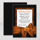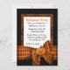Convite de festas preto e alaranjado bonito do Dia das Bruxas. Gráficos de um quadro em torno de um campo branco do texto e uma fita alaranjada e preta da xadrez e de um arco pretos e alaranjados, na parte inferior, com uma abóbora no meio do arco. Personalize todo o texto para sua festança do Dia das Bruxas. Apropriado para partidos do adulto e das crianças.