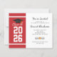 Adicione seu ano de graduação, nome e detalhes do local com data para este moderno fundo vermelho e branco negrito com convite de festa de formatura de tipografia negra usando nosso botão "Personalizar"
