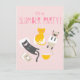 Um convite adorável e personalizável para uma festa de pijama, imaginando três gatinhos com travesseiros, pipocas e revistas.