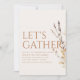 Este belo convite de Ação de Graças mostra a frase "Coleta de Vamos" em um roteiro grande e elegante no topo, definindo um tom acolhedor e festivo. Abaixo, você encontrará espaço para todos os detalhes essenciais da parte, como data, hora e local, garantindo que os convidados tenham todas as informações necessárias. Do lado direito, as folhas de aquarelas moles caem e as flores adicionam um toque de encanto e calor autóctones. Este convite cuidadosamente desenhado captura o espírito de união e gratidão, fazer-o a escolha perfeita para convidar os entes queridos para a sua comemoração de Ação de Graças.