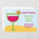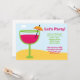 Este convite de festas tropical é perfeito para uma festa de aniversário, luau, ou sempre que sua festa tem um tema tropical. Tem um coquetel cor-de-rosa com um guarda-chuva na praia sob um céu azul com nuvens.