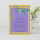 Convite festivo para sua festa de Mardi Gras com máscara colorida e agitadores em fundo roxo com borda dourada. Fácil de personalizar com os detalhes do evento.
