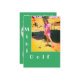 Imagem de mini golfe feminino em fundo verde na frente e detalhes da festa no verso.
