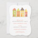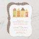 Um design divertido apresenta uma fila de pequenas casas doces em tons alegres de verde, laranja e marrom nesta tomada contemporânea do tema do Partido do Aquecimento Doméstico.