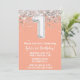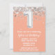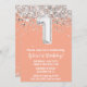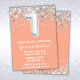 Convite de aniversário de cor de pêssego e primeiro aniversario de prata com convite de festas de idade 1 com brilho e moderno roteiro escrevendo e balões de folha divertida.
