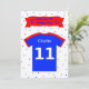 Este convite de aniversário brilhante e colorido é ideal para rapazes e raparigas. Na frente do cartão, a mensagem na faixa vermelha de aniversário é "Venha à minha festa de aniversário de 11". Há também uma camisa vermelha e azul no estilo esportivo, com um grande número branco 11, pronta para você personalizar com um nome. No verso do cartão há muitas linhas para detalhes da parte.