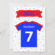 Este convite de aniversário estrelado divertido está pronto para o seu texto personalizado. A frente da placa apresenta um grande banner vermelho de aniversário com a mensagem "Venha à minha festa de aniversário de 7". Há uma camisa vermelha e azul no estilo esportivo, com um grande número 7 branco e espaço para o nome da criança. No verso do cartão, você pode digitar os detalhes da parte.