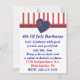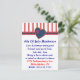 Diversão do convite de festas de 4 de julho, feito em listras vermelhas e brancas no topo, cortado com uma fita bonito e um coração azul e vermelho. Personalize o texto para a sua festa do dia da Independência.