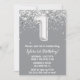 convite de festas de cinza e primeiro aniversario de prata de idade 1 convite de aniversário com brilho e moderno guião escrevendo e balões de folha divertida.