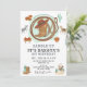 Um "sela-se" fofo e caprichoso cowboy ocidental selvagem, primeiro convite de aniversário em terracotta browns e blues para um menino, com equipamento de cowboy ocidental e animais de rancho. Saddle, steer, cavalos, cacto, sela e lasso. Tudo o que o cowboy precisa. É o primeiro rodeio dele! A parte de trás do convite tem um efeito de madeira marrom-escura.