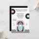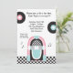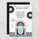 Personalize este convite de festas de estilo salto de meias, preto e azul, da versão 1950, apenas mude os detalhes da festa e você está pronto! Apresenta chão, jukebox, discos e notas musicais, cor-de-rosa e preto. Alguns elementos © Cocoa Studios MATCHING ENVELOPES estão disponíveis para compra abaixo