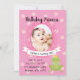Convite de festas princesa rosa. O design da frente é um fundo de bolinhas rosa com um gráfico de espelho rosa vibrante e um banner anunciando a aniversariante, um gráfico de príncipe do sapo fica no canto inferior direito do convite. A parte de trás é um simples padrão listrado rosa.