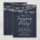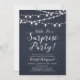Celebre seu dia especial com este convite de festas de aposentadoria surpresa. Este design apresenta uma tipografia com na moda de script e cordas leves em um fundo de madeira rústica azul marinho. Perfeito para uma festa de jardim, festa de celeiro ou qualquer festa surpresa.
