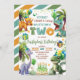 Convite de festas de segundo aniversário de dinossauro com T-Rex, triceratops e balões com tema de selva. Modelo perfeito para uma comemoração de aniversário de dino ruidosa.