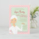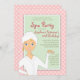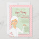 Uma garota bonito de olhos azuis está pegando uma manicura enquanto escondido em seu robe branco peludo por um dia de pampering no spa. Uma ideia de festa de aniversário excelente para adolescentes, adolescentes e formandos! Em rosa pastel e verde minúsculo com bolinhas.
