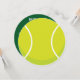 Esta bola de tênis estiva o convite de festas redondo temático apresenta uma bola de tênis amarela e branca na frente. A parte de trás do convite tem áreas modelo para você personalizar com as informações de sua parte.