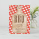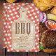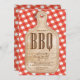 Convite divertido para churrasco com um conselho de corte em um fundo de gingham vermelho. Sacudir que o nosso cozinheiro barbeque convide para encontrar uma resposta para um toque especial extra.