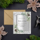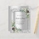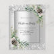 Fundo de aspecto fino prateado decorado com cones de pinheiros, bagas brancas, folhas verdes, brilho falso prateado, brilhos. Personalize e adicione os detalhes da sua festa. Letras negras. 1 folha = 1 convite impresso de borda a borda.
