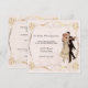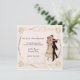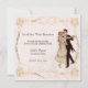 Um convite de casamento único para um estilo vintage ou evento de 1920. Imagem romântica de um casal dançando. O cavalheiro está vestido de terno preto com caudas e a senhora está vestida de vestido creme. Este convite é destacado com bordas de efeito ouro com flores em cada canto. Facilmente personalizável para que você adicione seus próprios detalhes. O Vintage Costume Party de 1920 vem completo com um envelope branco.