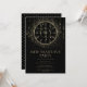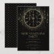 Convite de Ano Novo elegante em preto e dourado. O design apresenta um relógio elegante em dourado, rodeado por luzes cintilantes e confetes dourados. Convide amigos e familiares para uma festa moderna de fim de ano com este convite de Ano Novo que pode ser personalizado com a inclusão dos detalhes da sua festa.