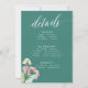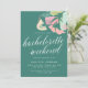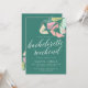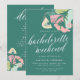 Um convite moderno perfeito para uma festa de despedida de solteira na praia. Esta design apresenta folhas tropicais e abstrato em forma de neo mint, lacre e verdes limões, cor-de-rosa milenar e coral em um fundo verde teal. O contrário inclui um Itinerário do fim de semana.