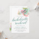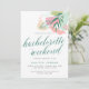Um convite moderno perfeito para uma festa de despedida de solteira na praia. Esta design apresenta folhas tropicais e abstrato em forma de verde, pinks e coral sobre fundo branco. "fim de semana de solteira" e o nome da futura noiva estão em verde-real. O contrário inclui um Itinerário do fim de semana.