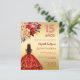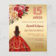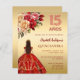Um convite moderno, elegante e glamoroso para uma festa de Quinceañera, festa de 15 anos. Fundo dourado falso, uma garota vestindo um vestido vermelho e dourado e rosas vermelhas, rosadas e douradas, flores. O nome é escrito com um estilo de letra manuscrita moderna. Personalize e adicione os detalhes da sua festa.