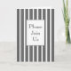 Um convite dobrado personalizado com letras de script e faixas de cinza em um fundo branco. Clique em Personalizar para alterar fontes, dimensionar, adicionar ou remover texto e muito mais, até mesmo salvar seu design para mais tarde.